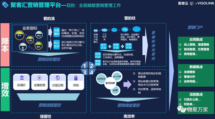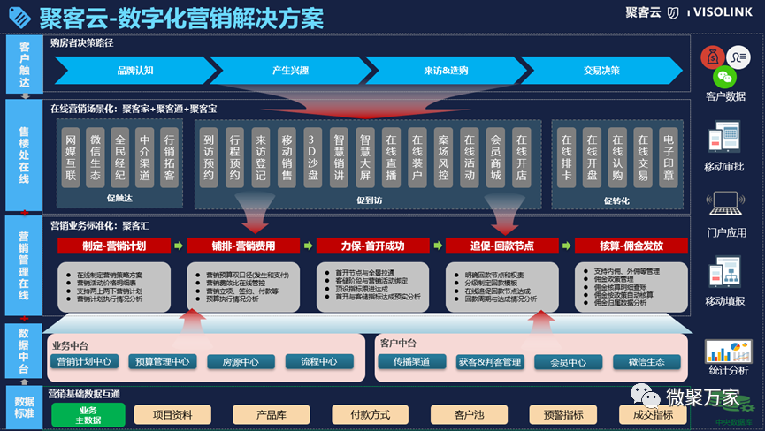 微聚万家根据旭辉集团营销管理的业务现状、管理诉求,结合微聚万家聚客云的产品方案,为旭辉集团量身定制整套的数字化营销信息化系统的解决方案。从制定营销顶设计划,支持两上两下营销计划铺排落地,实施监控计划执行的偏离度;首开项目管控,管控从首开计划、客储指标、活动落位全面管控营销各阶段的客储指标达成情况;佣金管控,实现各通路佣金在线进行佣金核算和结佣;营销流程管控,实现营销全流程改造上线和数据打通,将退换房、更名、营销特殊审批、销售政策、定调价、折扣管理、认购/签约变更等多项营销流程进行升级重造,将审批数据以红黄绿灯可视化行为进行预警管控。