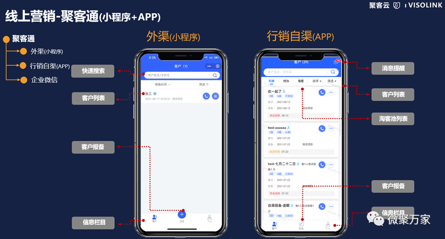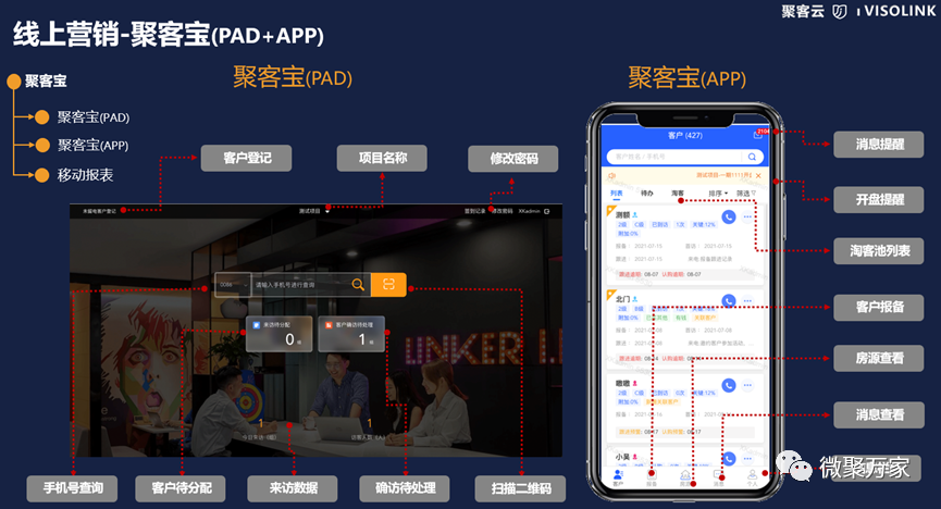 除以上内部营销管控系统外,微聚万家还为旭辉集团替换了以往云客类的产品,为其量身打造旭客家(掌上售楼处)、旭客通(自渠和外渠)、旭客汇(数字案场)等营销小程序和APP应用,完美兼容各项目新老数据切换和旭辉内部各第三方的数据打通。