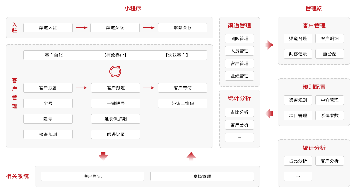 完整的外部渠道对接流程,根据不同项目特点可设置不同的渠道规则及判客规则,解决人工判客、渠道抢客等一系列问题