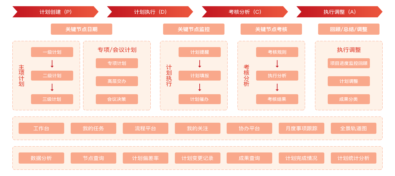 通过计划管理平台,集团可对各区域公司的计划进行分层级管理,明确计划管理和控制的重点,在集团内部形成计划完成的统一标准, 从而实现跨区域多项目计划管理模式的快速复制。系统对各级计划执行跟踪督办分析,适时发布预警,能满足项目开发产业链各环节顺利 有效衔接,提升每个开发计划环节的工作品质,确保每个环节在限期内完成,最终在公司内部实现规范化、标准化、精细化的管理模式。