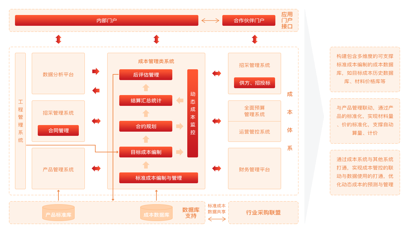 产品覆盖开发过程中各项成本费用的管控,项目开发成本以成本核算及成本控制为两条核心管控主线,建立以合约规划为核心,贯穿于目标成本到成本数据库的全业务链条的动态成本管理体系,通过建立标准、明确目标、过程监控、阶段回顾实现企业全生命周期开发成本的可知可控。通过系统构建成本、工程、合约、营销及财务各成本相关业务部门统一工作平台,实现成本管理业务流程的标准化、成本控制的规范化和成本核算的精细化管理
