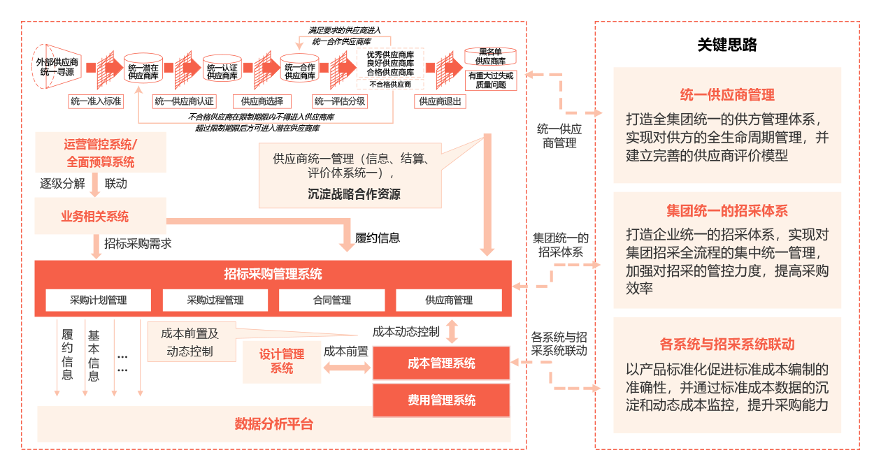 通过信息化手段,实现招投标业务流程的自动化、严谨化、透明化,将招投标业务按照企业制度统一规范管理, 可多视角监控各个招标项目的进展状态,满足采购业务从招标计划、招标准备、启动招标、中标、签约、供方评估等全流程管控。 同时加强供应商统一管理、互动与协同,持续沉淀战略性合作资源。