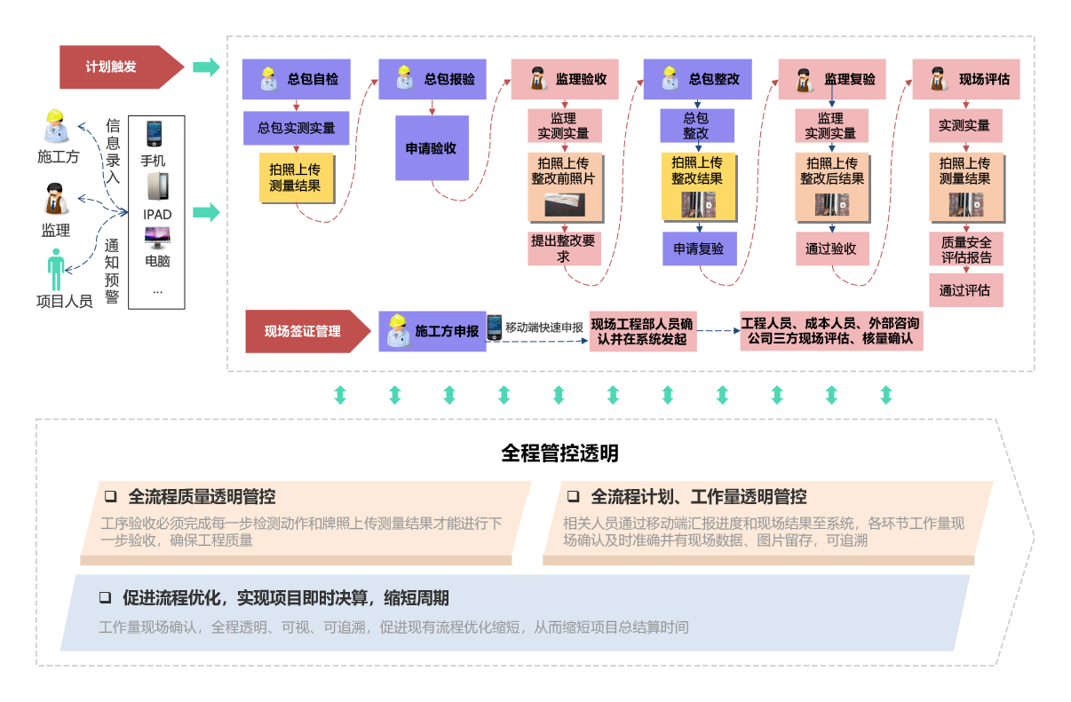 以建筑工程质量管理体系理论为基础,实现了行业工程管理项目全生命周期质量动态管控。解决行业因项目周期长、变化快、复杂度高等因素带来的质量管理问题,实现信息和知识的有效管理及流程的严格把控,全面提升企业项目质量管理水平。在系统中完成问题整改落实、督促及闭合工作,同时根据系统中的数据进行数据系统及问题的持续改进。实现全流程工程质量的透明管控,有效提升工程质量,促进流程优化。